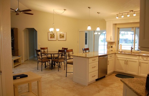 Entertain guests by shooting a game of pool in the casual living room or relax on the large screened in lanai. The pool and lanai face west so you can enjoy a beautiful sunset every night. Formal dining is also available for dinner parties or family gatherings. A living room with two full size couches (one a pull out bed), entertainment center with 55 inch smart tv, DVD player, games and more are also available. The custom white kitchen is complete with granite countertops and stainless steel appliances. Kitchen peninsula has seating for two and a four person kitchen table. Walk out onto the lanai from the master bedroom, dining room, kitchen or third bedroom. Bathrooms completely remodeled with tile throughout. Wooden interior shutters offer privacy.