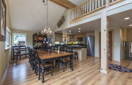 Designed for comfort, this tastefully furnished 4-bedroom, 2.5-bath cabin blends modern amenities with rustic charm. The vaulted, beamed ceilings and large river rock fireplace create a warm and inviting great room—perfect for gathering with family and friends. The fully equipped kitchen features granite countertops, bar seating, a spacious dining area, and stocked essentials—making it ideal for group meals and holiday feasts.