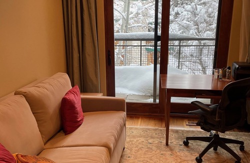 The office/den has a deck overlooking Trail Creek and an American Leather (branded) fold out Queen platform bed.