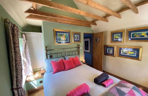 Upstairs you’ll find two double bedrooms with open-beamed ceilings. Thick curtains ensure restful nights. In between these two bedrooms is a calming bathroom with a bath and shower.