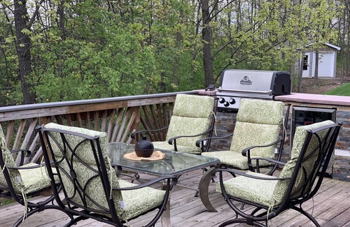 Our home is a perfect place to stay. Secluded on the end of a cul-de-sac with lots of trees and beautiful views off our deck. We are right on the flight line so lots of planes fly right over to view ( during EAA only). We are located 7 miles from the EAA grounds. The first floor has two bedrooms with king beds and two full bathrooms. A half bath is also located on the first floor. Our lower half has a walk out basement that leads to an amazing pool (A perfect place to cool off) with plenty of entertaining room (Blackstone grill is also by the pool area). Downstairs has two bedrooms both with king beds. Also a bonus room with two queen beds. Downstairs each bedroom has their own half bath (One toilet and a sink) which leads into a joined full bathroom. The outdoor deck has a wet bar and a grill and an amazing 8 person hot tub. The beautiful wooded lot has an fire pit. This is our family lived in home and we only rent it out for the week during EAA and for this coming 2025 Draft! We are approximately 58 miles to the packers stadium.