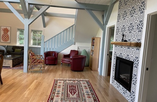 The Guest House at Tripping Gnome Farm is a light-filled and airy space featuring 4 bedrooms, 2.5 bathrooms, a kitchenette, and a large open living area with a gas fireplace. A former barn renovated in 2022, the house is situated on our working organic farm and has access to several miles of hiking trails from the backyard. Guests here also have access to kayaks that they can use to navigate Kelsey Brook, which leads to the Haraseeket River. A fire-pit provides a cozy gathering spot for guests as well. Our quiet and idyllic farm property is located only 5 minutes from downtown Freeport, home of the L.L. Bean flagship store as well as a multitude of other outlet stores to satisfy everyone's shopping needs. Equidistant to the farm is Wolfe's Neck Woods State Park, filled with oceanside hiking trails, as well as Wolfe's Neck Center for Agriculture & the Environment, a sustainable dairy farm which hosts educational and community programs.