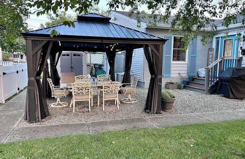 Fully renovated Village Green quad in a quiet section of Cape May. Comfortable family getaway with large granite island with counter seating. Has a window dining area for additional seating with views of the courtyard. The house has 2 bedroom, 1 1/2 bath with outdoor shower. Close to the Coast Guard base and six blocks to the beach! Shaded backyard with seating area under the trees along with an outside screened in dining area! Perfect family retreat for summer or fall get away! Sleeps up to 7 people. Has beach chairs and four beach tags for use during your trip. Also has an outdoor gas grill and 2 Beach cruisers that can be used during your visit.
