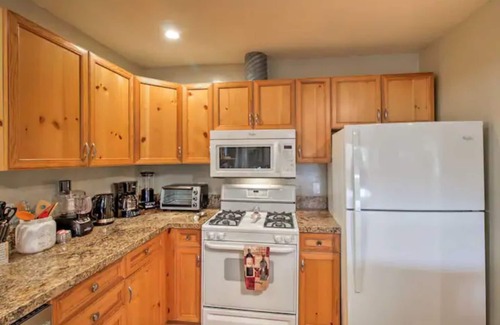 Full kitchen, gas range and oven, dishwasher, microwave and fridge with ice maker. Fully equipped kitchen, dishes, glasses, (lots of wine glasses of course), tableware, pots and pans, coffee maker, electric kettle, (reverse osmosis purified drinking water makes great coffee & tea), blender, food processor. Cooking basics, regular coffee, decaf coffee. Granite counters and copper top island.