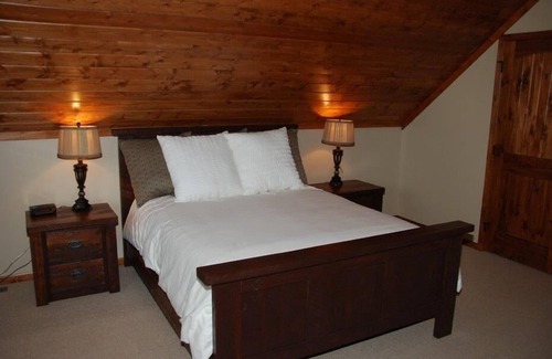 Guest Room 1 on the 2nd floor has a vaulted ceiling and is as large as the Master bedroom. It sleeps 2 with a queen size bed. The kids love Guest Room 2 with its bunkbeds (queen mattress below and single above). This room also has vaulted ceiling and a walk in closet. There is a Jack'n'Jill bath shared by Guest Room 1 & 2. Guest Room 3 is on the lower level and has a queen bed. The 2nd floor Loft overlooking the lake has a sofa sleeper. The lower level family room has a sofa sleeper with oversized flat screen TV and game area. All bedrooms and living areas have a flat screen TV except Guest Room 2.