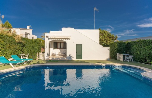 The charming holiday apartment “Apartamento Delfín 2” is located in Cala Blanca, Menorca, and it is the perfect accommodation to enjoy a relaxed holiday very close to the sea. It has been decorated with delicate colours to create a relaxing atmosphere for your holiday and it consists of a living room (with a sofa bed), a well-equipped kitchen, 2 bedrooms (one with 2 single beds, one with a double bed), as well as one bathroom and can therefore accommodate 6 people. Additional amenities include Wi-Fi, air conditioning, a television, a baby cot and a highchair. The outdoor area, which is shared with 2 more properties, offers a swimming pool where you can take a refreshing dip, sun loungers where you can relax under the sun with a good book, as well as a barbecue area where guests can prepare and share delicious dishes. Due to its excellent location you will find a selection of shops, restaurants, bars and cafes right next to the property. Although the sea is just 156m away (2 minutes walking), the closest sandy beach is Cala Santandria, which is just 5 minutes driving from the property (2.7km). Guests can go on a day trip to the picturesque town Ciutadella de Menorca (15 minutes by car; 6.9km) and, especially if they are traveling with children, they can visit the water park Aquapark (20 minutes driving; 10.8km). The airport of the island can be reached after a 48-minute drive (50km).