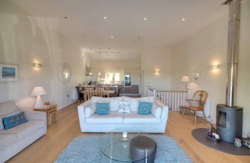 This fine contemporary (mid terrace) home with level access has a vaulted ceiling to the first floor open plan lounge / dining / kitchen area creating a spacious family environment. The sea and hillside views from here can be enjoyed from comfy sofas, or seats and table on the large south west facing balcony, enabling you to relax and enjoy all weathers. The woodburner warms up even the chilliest evenings, and for warmer days the leafy decking area with charcoal BBQ and deck games will draw you outside. The restful décor throughout reflects the colours of sea, sand, sky and hillside, complimented by the pictures and other decorations.