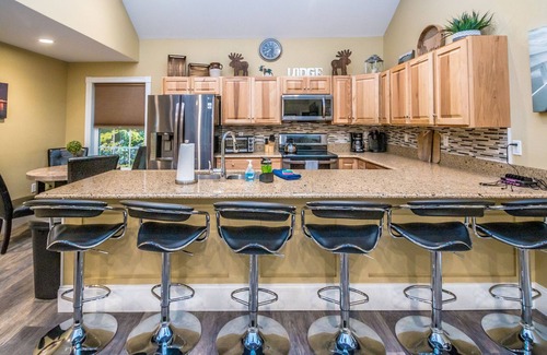 The main level of the home features an open concept living space. A large living area with plenty of seating around the 50" tv, a beautifully appointed kitchen with maple cabinets, marble counter tops with seating for 6 as well as a dining area with seating for 6. The living room features comfortable seating for all to watch the big game or sit around and play your favorite games. The first of two bedrooms on this level features a Full-sized bed, bunk beds and a walk-in closet. The second bedroom has a queen-sized bed and also a walk-in closet. 2 full sized bathroom, one ensuite, round out the first floor. New wood fireplace added in 2021 and an amazing back yard with plenty of entertainment. Cross the bridge over the water-brook to gather around the outside fire pit. Play some horseshoes or our giant size Jenga set. You won’t want to leave this oasis.