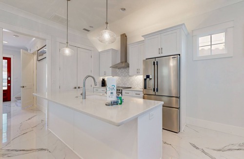 One of the bedrooms is conveniently located on the first floor, offering privacy and easy access. The primary suite and two guest suites are situated on the second floor, providing ample space for everyone. The elegant master bath boasts a soaking tub and a marble-tiled shower, creating a luxurious oasis for relaxation. The entire home is tastefully furnished with luxury pieces and adorned with coastal décor, immersing you in a beach-inspired atmosphere.
