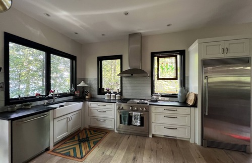 The main floor is a uniquely open space with full sight lines from end to end. Enjoy drinks with friends or prepping dinner at the restored 12 foot island that used to be in a general store. A GE Monogram gas oven with 5 burner stove top provides ample space for meal creation. The large farmhouse sink makes it easy to wash the fresh fruits and vegetables you can pick up daily from the local farms. A feature of the kitchen is the full Frigidaire refrigerator that will keep all your foods fresh.