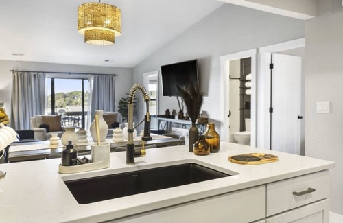 After a day full of activities, unwind in your super chic 2-bedroom, 2-bathroom condo. The bright and open living room features soaring ceilings and plenty of natural light, creating a welcoming space to relax. Sliding glass doors lead out to a private balcony with patio furniture where you can enjoy gorgeous lake views and al fresco dining while the sun sets over the hills.