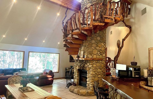 The lodge showcases a unique spiral staircase crafted from pine and manzanita by the owner, adding a touch of rustic elegance. Our one-acre, unfenced property is surrounded by towering pine, fir, and ponderosa trees, creating a tranquil setting. Encounter local wildlife such as California grey squirrels, many birds including blue jays, wood packers, and hummingbirds, also on occasion, raccoons, deer, coyote and bobcats have been spotted!