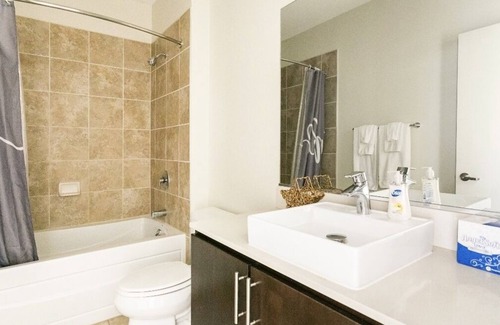 Beautiful loft style apartment located in the heart of Down Town Silver Spring. Steps away from the metro station and a short walk to a plethora of dining, shopping and entertainment options. Feel right at home with a fully equipped kitchen, warm fire place and full size tub perfect for enjoying a nice bubble bath. Queen size bed with comfy mattress and plenty of extra sheets and linen at your disposal. Enjoy the breath taking view of the silver spring dc area from the rooftop amenity space or kick back relax in the sky lounge.