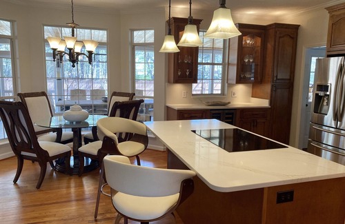 4BR/2.5BA home with custom screened in porch, great for entertaining. Bedrooms with custom bedding and drapery. Master bathroom with travertine floors and walk in shower and spa tub. Large walk in closet with plenty of space and a island in the center of the closet. Guest bathroom with travertine walk in shower. King size bed in Master bedroom and queen beds in the three guest bedrooms. Screened in porch with outdoor seating, farmhouse table and full kitchen with grill, cooktop and oven. Kitchen with stainless steel appliances and wine bar. Home has been completely remodeled. Home is 10 miles from Augusta National.