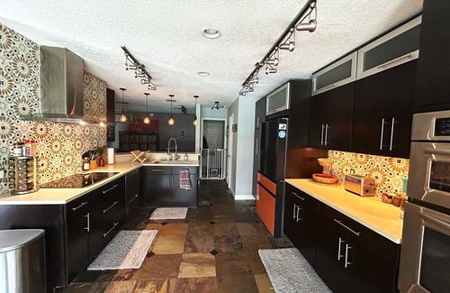 Looking to get aways from the vacation hustle and bustle, but still want to be close to theme parks, shopping, and dining? Come stay on the lake where you can relax on the dock and fish or take a dip in the pool. After a nice afternoon of kayaking or paddleboarding on the lake, rinse off in the gorgeous outdoor shower. Cap off the night by sitting fireside while sipping a cocktail. And that is just on the outside of the property! Inside you can play a game of pool on the ultra-modern pool table. Like cooking or baking? This kitchen is your dream! Boasting a convection oven, induction cooktop, all the cooking ware needed, plus lots of counter space. You can host a dinner that will feel easy, and dare I say, fun!
