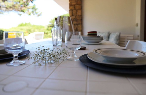 The sizable and comfortable two-family house, situated in the hamlet of Portobello di Gallura near Aglientu, Italy, offers a delightful vacation rental experience. Surrounded by a natural garden, it boasts amenities such as a yard and a tennis court within proximity.