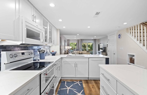 Enjoy this beautiful open floor plan on the main level with a bright, fully equipped kitchen with bar seating for 2. The spacious primary bedroom has a king bed, nightstands with usb ports on the back, bench seating, black-out curtains, walk-in closet, large smart tv and en-suite bathroom.