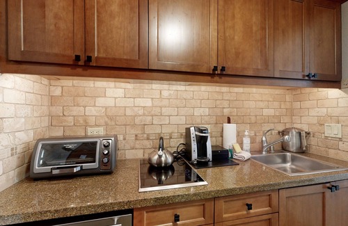 Step inside this fully remodeled hotel-style suite to find a cozy living area complete with a gas fireplace, flat-screen TV, and a comfortable sofa - ideal for unwinding after a day of outdoor activities. The dining table nearby offers seating for four, perfect for enjoying meals with loved ones. The well-equipped kitchenette features a mini-fridge, small electric stovetop, Keurig coffee maker, and dishwasher for your convenience.