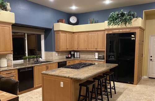 Come bring your family and enjoy Sunny San Diego in our large four bedroom 4.5 bathroom plus separate guest house vacation retreat. This beautiful home is situated in a gated community on 2 lush acres and has full access to the resort-like back yard including swimming pool, waterfall, jacuzzi, fire pit, basketball area, viking grill, and a spectacular wood fire pizza oven. The evening lights and ambiance is perfect for entertaining! This north San Diego county suburb has a country feel and is walking distance to several different trails, including beautiful Lake Poway, where you can feed ducks, go fishing, hike to the famous potato chip rock, or rent a paddle boat. Only 30 minutes away are some of America's finest beaches, the world famous San Diego Zoo, Seaworld, Legoland, Balboa Park, Gaslamp district, and so much more! Inside the main house, you'll find a full sized kitchen stocked with everything you need to feed and entertain your group, washer/dryer, and 4 bedrooms plus 2 pull out beds accommodating 12 comfortably. The guest house has its own kitchen, bathroom, and sleeping for an additional 5. Go spend the day at the beach and feel free to use our surfboards, boogie boards, snorkel gear, beach chairs, coolers, umbrellas, and sand toys. All linens and beach towels are provided, so come out and get ready for a beautiful stay here in America's Finest City.