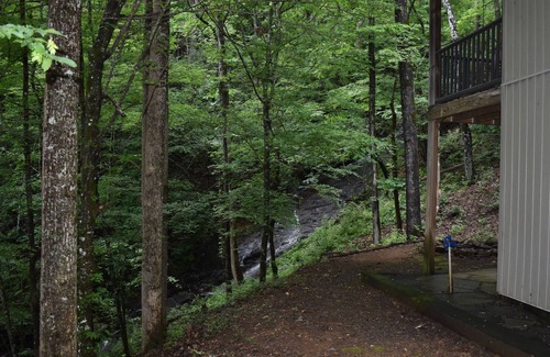 a very nice cabin with a beautiful water-falls 20 feet in front of you on the porch