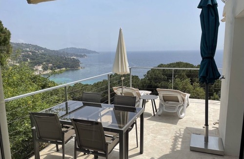 60m2 apartment with terrace L-oriented Southeast 35m2 ideal to enjoy the beautiful sunrises and sunbathe until mid afternoon, with a panoramic view of the sea and islands. Comfortable and spacious, this apartment is equipped for 4 people including a dining room with a splendid view of the sea and the hill, a large living room flat screen TV corner and leather sofa, desk with WI-FI connection, a master bedroom, spacious with 160 bed, opening onto the terrace View Sea, was second bedroom or living room with a sofa bed 160 for a nap fresh opening to the terrace and view Wed. Ideal for a couple enjoying the space, two couples or a family of 4 people. quiet location, villa consisting of three apartments two of which are for rent and owner-occupied. gated property, lush garden views, a pine forest of pine trees and the sea that dominates each room. Kitchen area with bar cabinet in the living room, bathroom with tub, double sink and toilet. Apartment very ventilated by its bay windows and cool in summer! Central heating in winter. Parking in front of the property.
