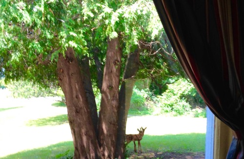 Outside, the large deck overlooks the serene backyard, complete with table, chairs and umbrella. Relax out on the deck after a busy day or enjoy some coffee while watching the deer stroll through the yard. At night, light up the tiki torches and fire up the grill for a great evening under the stars.