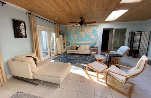 Lounge by a private saltwater pool, relax in the sky-lighted lounge, and Enjoy everything downtown Deland and our surrounding area has to offer. Our 3-bedroom, 3-bath pool house rests in a quiet neighborhood within walking distance from historic downtown Deland full of great restaurants, bars, and shops. Complete with a beautifully updated kitchen and accommodations for 7 guests. Our home is only 30 min away from Daytona Beach, 60 min from Orlando and it's theme parks, and in close proximity to many springs & state parks.