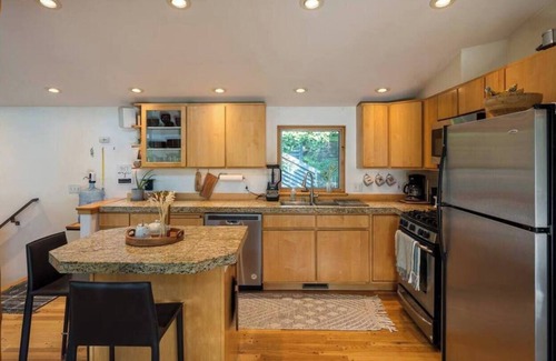 This comfortably furnished home a wonderful respite for reading, lounging and coming home from the boundless activities the Sun Valley/Ketchum community has to offer. The second floor living/dining/master/office make it feel like a treehouse. The downstairs bedrooms, bath, and large sunny entry make it easy to be organized with plenty of storage for winter gear. This home is stocked for cooking and relaxing. Plenty places to read and retreat. We pride ourselves on clean and healthy living. The outdoor spaces include a Traegar grill, hot tub in the trees and gas fire-it. It is a large private lot in friendly neighborhood. You are 3.5 miles to the River Run Lodge skiing, a trail outside the door is groomed all winter for nordic skiing. It's an ideal retreat for an extended stay that makes you feel at home away from home. We may take pre-qualified dogs. Please tell us about yourself and trip and if you have a dog please send a picture of your furry friend.