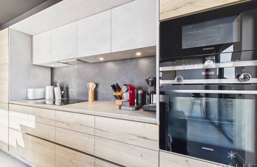Fully equipped American kitchen: ceramic hob, fridge and freezer, dishwasher, oven, microwave.