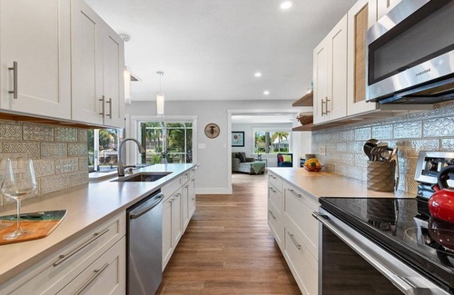 This home is beautifully renovated for optimal enjoyment of the Florida outdoor lifestyle. There are plenty of places to just hang out in the pool area or in the spacious family room. The family room looks right over the pool where you can plan to spend plenty of time. Whether you’re enjoying happy hour or reading a book, this cozy spot is the perfect place for you. The kitchen is stunning with its upgraded cabinetry and granite countertops.