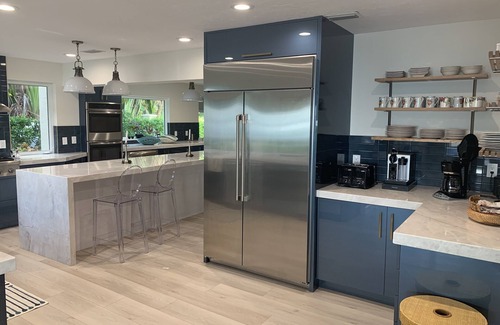 The gourmet kitchen is made for entertaining and equipped with a 14 foot waterfall quartzite island, Thermador gas range with 6 burner and built in griddle, 48" GE refrigerator/ freezer, GE double ovens, 2 warming drawers, 2 dishwashers, ice maker and wine refrigerator. Included are top of the line, newly purchased accessories such as a coffee maker, blender, food processor, immersion blender, and juicer (all Cuisinart and Kitchenaid). Plates, cups, cutlery, serving platters/bowls, etc... equipped for 20+ people. Adjoining the kitchen is a sitting area.