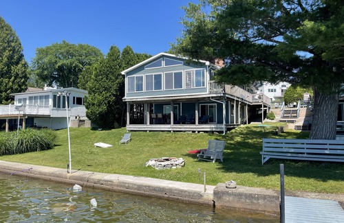 Our 3 bedroom, 2 bath home has a huge 3 season sun room on the second floor with an even bigger covered deck below. The main floor has the kitchen, two bedrooms, living room, the sun room and a bath. The lower floor has a huge family room with two sets of sliders onto the deck plus another bedroom and a full bath with clothes washer and dryer. The property also features a large, deep water dock for your boat. Weekly rentals are Saturday to Saturday in the summer and are flexible the rest of the year.