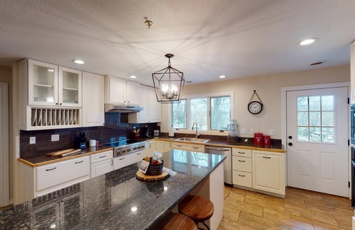 Discover the ultimate retreat at Big Bear Cabin #1, a spacious getaway featuring 7 bedrooms, 4 bathrooms, and sleeping accommodations for up to 18 guests and your dog. Boasting a generous 3470 sq.ft this cabin is ideal for family reunions or group gatherings. The large open floor plan facilitates shared moments, while two living rooms and two fully equipped kitchens allow for collaborative meal preparations. The second kitchen is conveniently steps away from the pavilion and can serve as a catering kitchen for events.