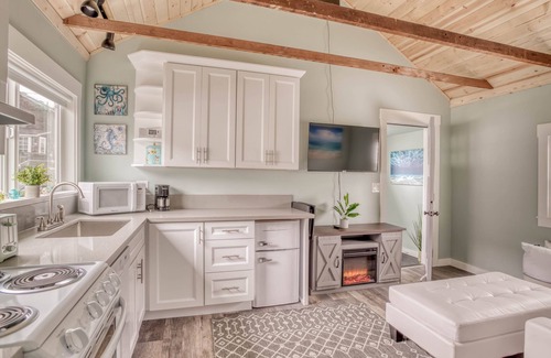 This classic, romantic cottage steps from the beach has been thoughtfully and skillfully updated to make your Oregon Coast stay extra special. With all-new interior flooring, walls, and beautiful tongue-in-groove vaulted ceilings, this cottage is a splendid place for a relaxing time at the beach. You’ll enjoy a Smart TV and cozy electric fireplace in the living area, where serene blue walls, the pale wood ceiling, and a plush white sectional and ottoman make the perfect place to lounge. A new, all-white kitchenette is fully equipped for dining in at a sweet windowed nook. You’ll also have your own picnic table outside for sunny days. The king bed under a fresh vaulted ceiling will lift your spirits—it’s a refreshing place to awake to the sound of gulls and surf.