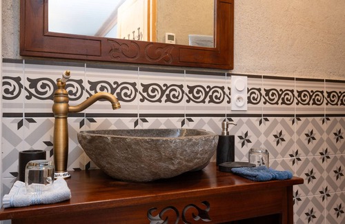 Four of the bedrooms are for 2 people, with a 160x200 bed, private shower room and WC. The fifth room is a family room for 5 people, with two separate bedrooms and two private shower rooms and toilets. One of the bedrooms is for 3 people, with a 90cm bed and a 160x200cm bed. The other is for 2 people with a 160x200 bed. A shared fully-equipped kitchen is at your disposal.