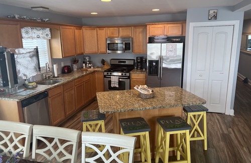 A fully equipped kitchen provides the chef with all the amenities for cooking and baking. A pleasure to cook and serve in the kitchen. Everything is at your fingertips, dishes, glassware, pots, pans, a crock pot, a margarita mixer, a griddle, kitchen aid, Keurig, and a Coffee Maker. These are just a small sample of goodies in the kitchen.