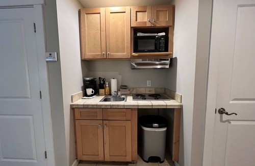 Perfect space for couples, or families with one child. Studio comes with a kitchenette and an apartment size fridge and countertop ice maker, and a Keurig is provided. There is also an on-site Starbuck's!!