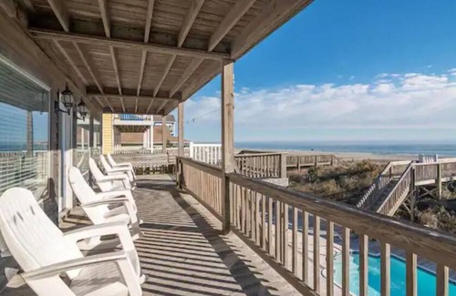 2 story beach front home with 5 large decks and ocean front pool.. Ideal location in Holden beach . 2 large bedrooms upstairs and 2 large bedrooms downstairs. 2 trundle beds upstairs in recreation room and work area and 1 pullout sofa in the front room /family room.