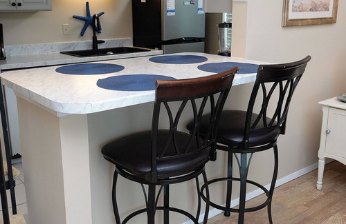 The condo comes fully loaded to make your stay comfortable. Full kitchen, free Wifi, new refrigerator, washer and dryer, 42” and 32" flat screen TVs with Netflix/Roku TV, cabinets, coffeemaker and blender, oven, beds and bedding, brand new hard wood floors, etc. The floors were redone in Fall of 2015, and kitchen was fully redone in winter 2022/2023. And the pool is an absolutely gorgeous sky blue with beach chairs and everything provided for you, even grills if you like cooking outside. Don’t bring any kitchen utensils, towels, a cooler, or kitchen supplies, it’s all already there!