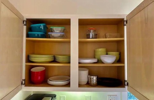 Fully stocked gourmet kitchen with stainless steel appliances (gas stove, double ovens, dishwasher, air fryer/toaster, coffee machine/K-cup brewer with complimentary coffee/tea, KitchenAid stand mixer, Vitamix blender, microwave, new refrigerator with ice maker, pressure cooker, slow cooker, rice cooker, variety of pots and pans, well-stocked spice cabinet). Dining table for 8-10 people.