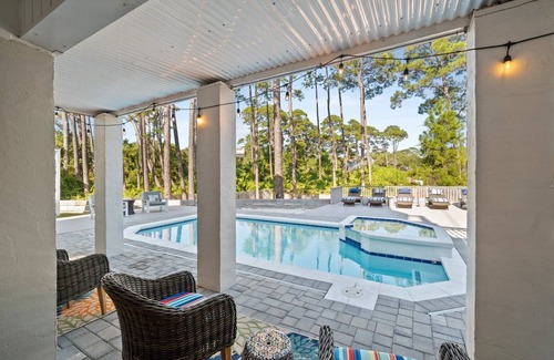 Want to enjoy a private neighborhood sparkling beach on the less crowded west end of scenic 30A adjacent to the pristine Topsail State Park!! Say no, more! This dramatic 4 story over 3000 sq ft beauty has wrap around balconies on two floors with gulf and dune lake views! Nestled in a private residential street, the front entrance puts you in the vacation mode right away with a serene koi pond and water feature! The back yard oasis is very large and private. It is fully fenced and has a great entertaining space by the heated pool/spa. We offer a convenient outdoor shower, deck lounge chairs, large eating space, a gas grill, an outdoor large screen television and a bose blue tooth speaker. The house has 4 bedrooms (2 master suites), 3 bathrooms & 2 half baths (with one by the pool). It also has a large open concept stocked kitchen. Dining and comfortable living room area with glass doors that open onto a spacious wrap around porch. The beach is a short 12 minute walk or 3 minute bike ride (we provide 6 adult bikes). You can also walk to the new