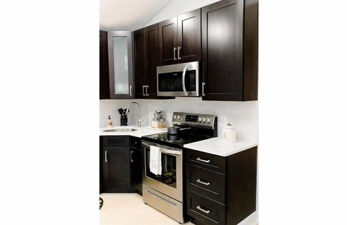 All that one needs! brand new appliances, coffee maker, silverware, grilling tools, serving utensils and plates, wine glasses. Complimentary hot chocolate. Dining room adjacent that seats up to 8 people