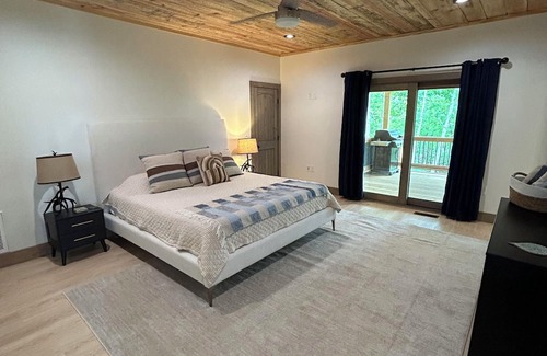 Escape to Big Foot Lodge in the Nantahala Mountains, where stunning natural views and serene surroundings create the perfect backdrop for family and group gatherings. We even promise you will catch a view of the elusive Yeti during your visit! Relax, unwind, and immerse yourself in nature's beauty at this idyllic mountain retreat. The view of the mountains are sure to mesmerize you whether you are cozying up on the wrap around outdoor deck or relaxing comfortably indoors as you gaze through the expansive 30 foot high windows that perfectly frame the Snowbird Mountains. Dine in or outdoors at the family friendly dining tables. Your hot tub stands on its own deck to provide both the privacy and proximity to the mountains. This hot tub placement also improves the safety to young children as the cabin deck is gated such that you can provide separation between young children and the hot tub. The loft area of Big Foot Lodge was designed with kids and adults in mind. The bunk bed offers a single bed on top and an expandable lower bed that can support up to a King Size. Additionally, the loft provides a pull out bed from the couch offering another full bed. The loft if supported by a large full bathroom, includes a 70 inch and a 55 inches TV and has its own beautiful views. Did you arrive in your Tesla or compatible electric car? If so, our on site Tesla charger will keep you powered up for exploring the many sites that are short drive from your lodge. Wander down to our pond with outdoor fireplace and be sure and grab one of the fishing poles provided. Feel free to cast and catch the brim and large mouth bass that populate our pond. Ready for some outdoor activity? Our lighted sport court invites you to play basketball, pickleball or other sports that require a court and you will find corn hole along with plenty of space to play in the yard or on the deck, locate at the cabin. A short drive will bring you to hiking, biking and equine trails that permeate the area and for a bit more excitement, enjoy the Nantahala Outdoor Center white water rafting, zip lining and many other activities they offer. For those wanting to experience some of the country’s best trout fishing, you will find an endless supply of streams for fly fishing or maybe the family wants a day on the water. Nearby lake Santeelah, Nantahala and Fontana offer boating opportunities with rental facilities available. Or maybe motorsports is your love. Bikers and sports car enthusiasts travel from across the country to experience the “Tail of the Dragon” offering 300+ curves in a short 11 miles. Weather not behaving? Our electronic game table by Arcade1 Up offers hundreds of family friendly games including many of the classics like Uno, Monopoly, Risk, Battleship, Spades, Sorry, Operation, Texas Hold’em and many more. Take in a movie powered by our Sonos sound system that will put you in the middle of the action or take a seat under our covered deck are and enjoy the dance of the clouds, mountains and rains. You’ll find comfortable outdoor seating to curl up and relax. The firepit situated in the front yard is likely one of the largest you will ever experience! Feel free to build a massive bonfire as firewood is provided and ready. If it’s been dry, be sure to assure there isn’t a burn ban in our area before lighting up that fire. You will find a smaller Solo fire place on the deck for a more intimate fire. For some outdoor card game time, carefully lift the table top off the circular outdoor table to expose the card game table. You’ll find full set of chips and cards to support whatever card game you have in mind. Need more to do? Inquire about our professional golf simulator and arrange a reservation to play one of the 30 awesome courses (not to mention other fun games) our simulator has to offer. The simulator is a 2 minute walk up the hill from your cabin. Our lodge is designed to encourage everyone to explore and have fun outdoors while offering all the indoor amenities and games to keep everyone happy.