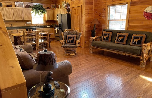 Big Nate is a 4 bedroom cabin with 2 full kitchens and 2 living rooms and 2400 sq ft of space. He is the bear who will greet you at the door. There are also 5 bathrooms in Big Nate for your convenience and privacy. The terrain is an easy slope for walking and a great place for kids to play. We have a seesaw and horse swing for the younger kids and horse shoes for the older kids. Big Nate has its own separate boat dock and a ramp to put your boat in the water. We have a 15 ft trampoline with a slide and launch. You can fish off the boat docks or just lay around and swim. There is a fireplace with shed and a firepit to sit around at night. There is lots of space to have your family outings.