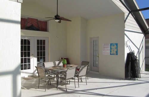 The pool/lanai/spa is south-facing and if the sun is shining (which it does almost every day in Florida) the pool area remains sun-soaked all day. The pool has a child safety fence and is fully screened.