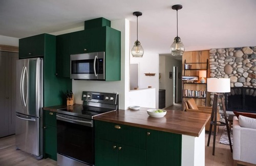 Downstairs has its own keypad entry door from the outside. You'll have a second living room with its own wood-burning fireplace, a 3rd queen bedroom, a large kitchenette & a full bathroom with a walk-in shower. This space also has a 4th queen sofa bed in the adjoining fireplace room. This room has its own outdoor access through a sliding glass door and is separated from the bedroom by a short hallway with a privacy curtain.