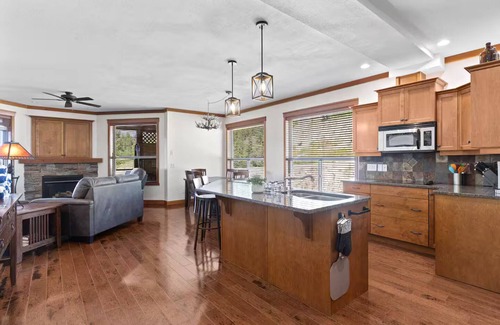 Enjoy deluxe amenities including a gourmet kitchen, oversized kitchen island for socializing, stone clad gas fireplace, indoor parking, covered balcony, and private outdoor hot tub.