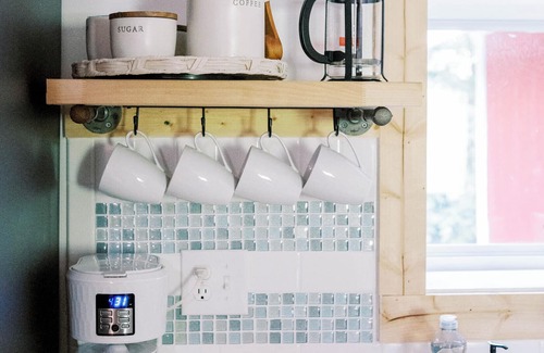 In the swoon-worthy kitchen, you'll find all the silverware, pots, pans and plates you'll need to pretend like you’re going to cook yourself dinner from scratch! ;)(But really, there is no need because the restaurants in our town are top-notch). The butcher block countertops overhang the new gray cabinets with silver hardware which nicely pairs with the tile backsplash. There is also a small vintage dining table with four chairs that is a fun nod to the fact that the home is quite vintage itself (103 years old to be exact!).