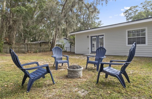 Conveniently located just 10-minutes away from the University of Florida's UF Stadium and Campus, as well as minutes away from North Florida Hospital and Santa Fe College, this spacious property features a roomy floor plan with a generous backyard. Enjoy a fully equipped kitchen and pristine bathrooms, offering plenty of space to relax. With two large living rooms equipped with Smart TVs, free parking, and a large yard complete with a fire pit, your stay will be both comfortable and entertaining