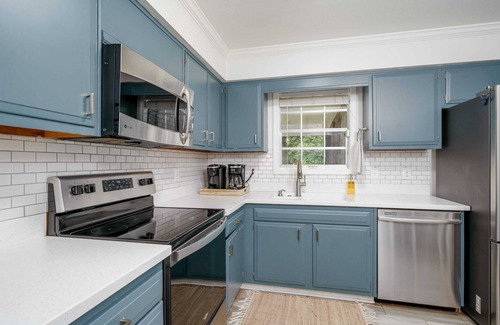 This 3-bedroom, 2-bath home offers a perfect blend of convenience and tranquility. With 2,080 sq ft of living space, it comfortably accommodates up to 8 guests and boasts dual living spaces. The primary bedroom features a king bed and ensuite bath, while two additional bedrooms offer queen beds and their own bathroom with a double vanity. Enjoy modern amenities like smart TVs, cable, high-speed internet (300 Mbps), a fully-equipped kitchen with a dishwasher, and an on-site washer and dryer.